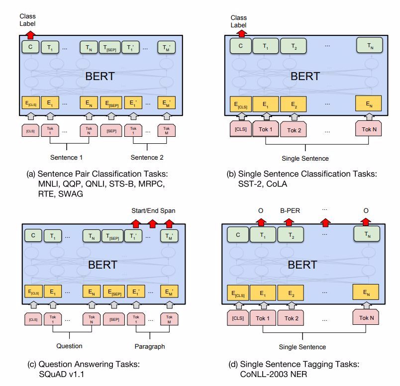 图3:我们的任务特定模型是由向BERT添加了一个额外的输出层而形成的,因此一小部分参数需要从头开始学习。在众多任务中,(a) 和 (b) 任务是序列级任务,(c) 和 (d) 是token级任务,图中E表示输入嵌入,T_i表示 token i的语境表征,[CLS] 是分类输出的特殊符号,[SEP] 是分割非连续token序列的特殊符号。