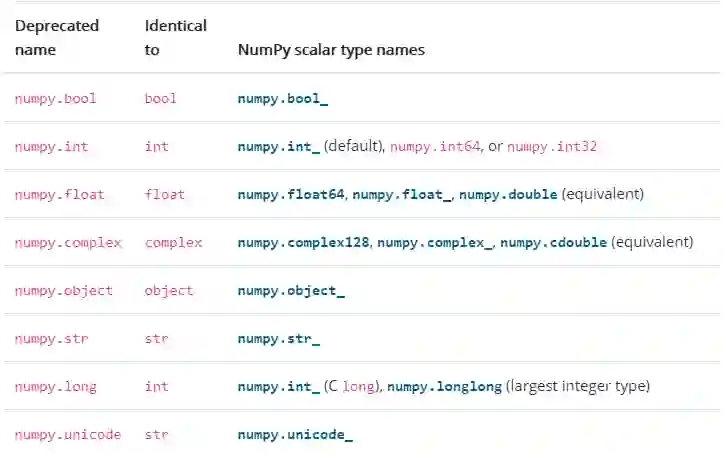 像 np.int 这类内置类型(builtin type)的别名已被弃用。在很长一段时间,np.int 是 int 的别名,但常常对新手造成困扰,这主要是历史原因造成的。