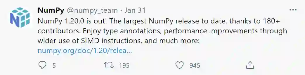 NumPy 1.20.0 版本上线,最新亮点包括 NumPy 函数注释、为数组提供滑动窗口视图等。