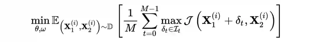 对抗训练可以认为是一种增强方式,它可以增加模型的鲁棒性。 [4] 通过实验证明了有监督情况下在节点特征上进行对抗训练可以进一步提升模型精度,我们将其引入到图对比学习中,公式如下: