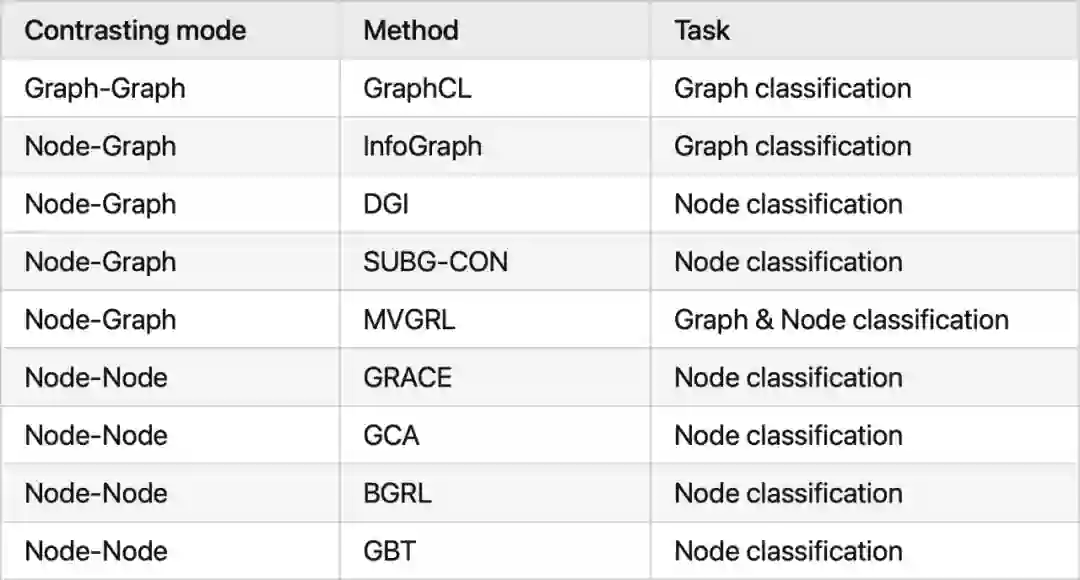 。node-level representations 之间进行对比称为 node-node contrasting level (i.e. local-local),node-level representation 和 graph-level representation 进行对比称为 node-graph contrasting level (i.e. local-global),global-level representations 之间进行对比称为 graph-graph contrasting level (i.e. global-global)。Table 1 是现有的一些方法的分类。