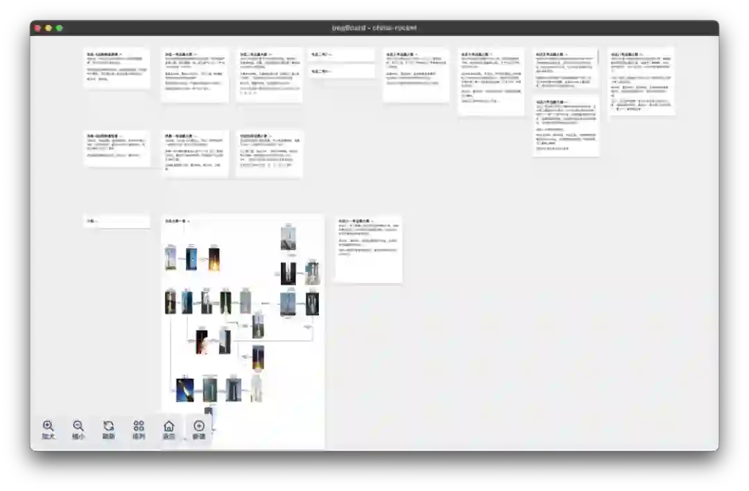 选择好文件夹之后,就会在白板上展示所有的文章卡片。你可以随意改变他们的位置大小,将这些卡片摆放成你思考逻辑中的样子。如果你觉得卡片太占地方,也可以把它收缩成一个标题的小卡片。