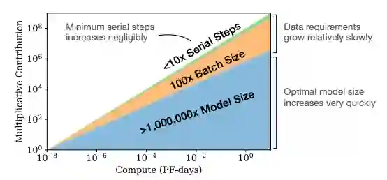 比如将来算力增长了十亿倍,为了获得最佳的结果,大部分精力应该用于增加模型大小。数据的增加可以通过增加批处理量来提高并行度,只需要很少的时间。