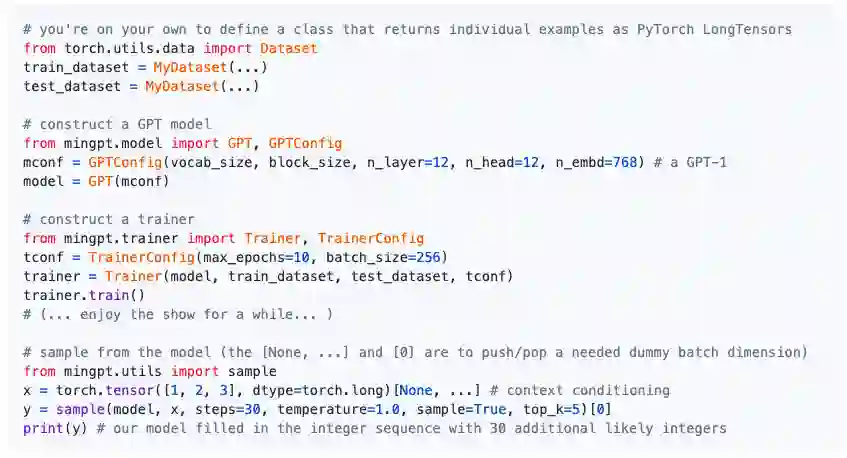 从代码来看,他的minGPT实现确实精简到了极致,利用Karpathy的代码,你只需要实例化一个GPT模型,定好训练计划就可以开始了,整个实现只有300行PyTorch代码。