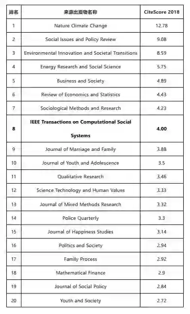 据Elsevier近日发布的期刊影响力榜单,IEEE TCSS在2018年的CiteScore再创新高,达到4.00,较2017年的2.36有显著的增长。从CiteScore排名来看,IEEE TCSS在“社会科学”学科类别的255个学术出版物中排名第8位,由2017年的前8%跃居前3%;在“建模与模拟”学科类别的259个学术出版物和“人机交互”学科的89个学术出版物中排名分别为第18位和第16位,由2017年的前15%和前29%分别上升至前7%和前18%。目前,IEEE TCSS在其所属的三个学科中的排名均已进入Q1区。