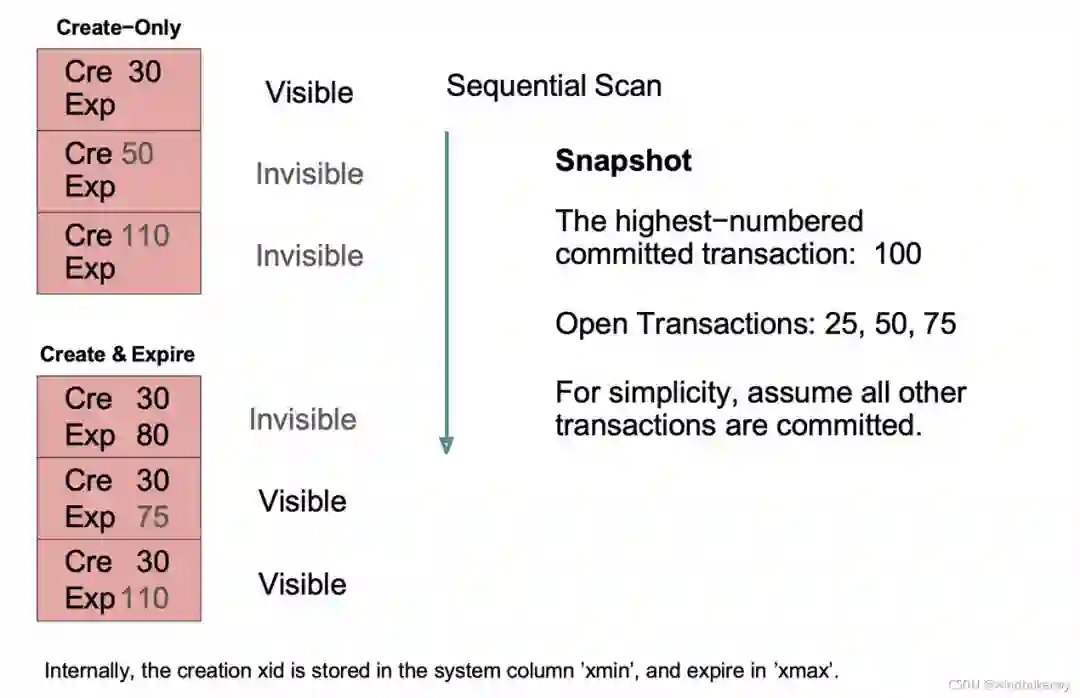 下面以 Postgres 为例介绍一下 MVCC 的一种实现方式,下图用以解释 Posrgres 里最基本的数据可见性是如何实现多版本控制的。
