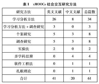 在上述检索结果的基础上,根据以下策略剔除不相关文献:(1)研究对象不符合xMOOCs内涵;(2)未包含与社会交互相关的研究内容。在浏览和初步研读相关文献后,共保留61篇文献(其中中文20篇,英文41篇)纳入分析范围。