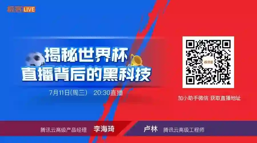 今晚八点半,腾讯云高级产品经理李海琦、腾讯云高级工程师卢林做客极客 Live 直播间,跟大家分享“世界杯直播背后的黑科技”