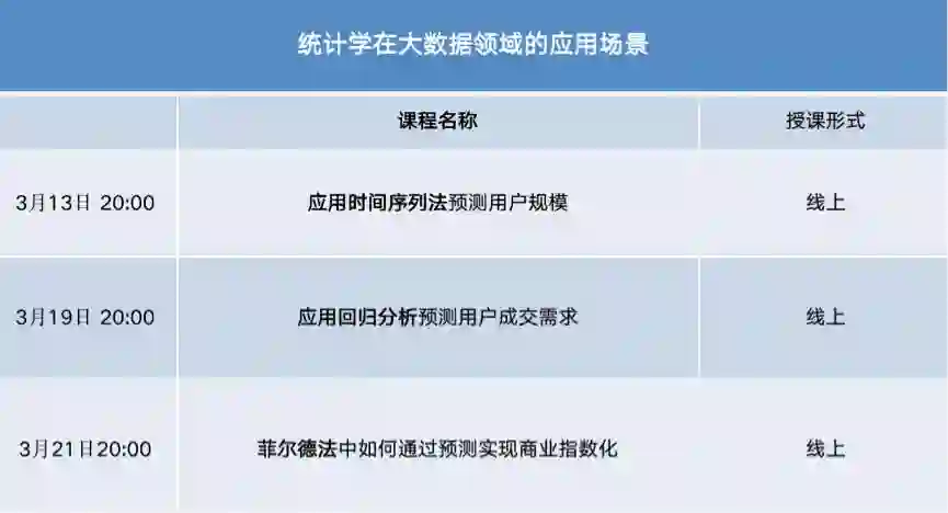 本次推出的课程中,就包含了统计学常见的时间序列分析、回归分析以及定性分析等理论在大数据领域的应用。同时,还将结合经典的案例分析,在方法论和案例的双重加持下,帮助学员在日常的工作中,能结合这些理论灵活使用数据分析工具。