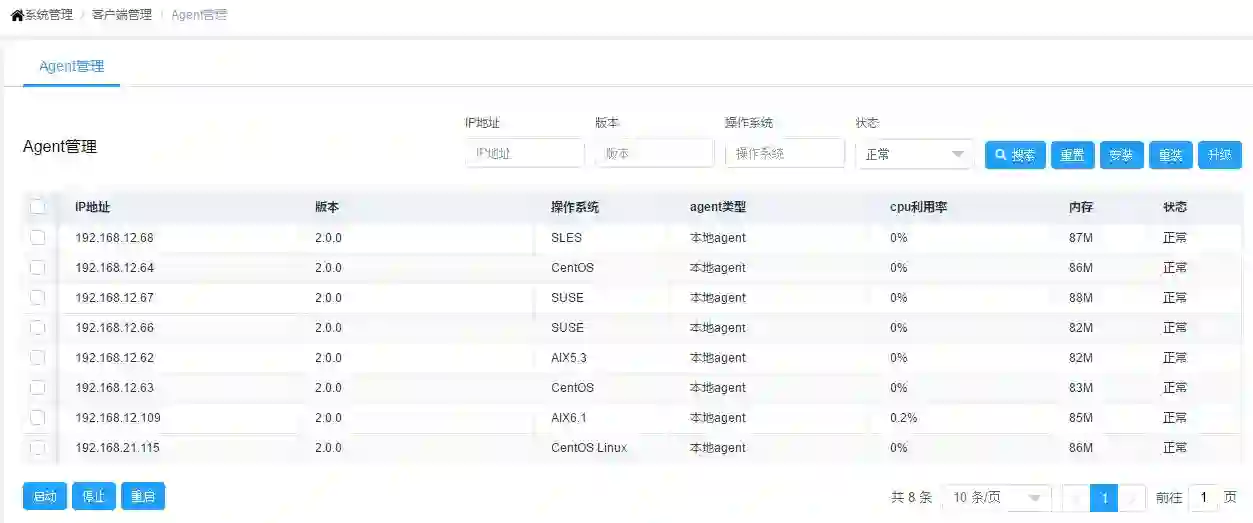 两者搭配部署,可覆盖不同的实施环境要求。平台提供了统一管理Web界面,以方便批量安装和升级,针对不同的系统能做到一键部署、一键安装、一键启停和重启。大大提高了管理效率。