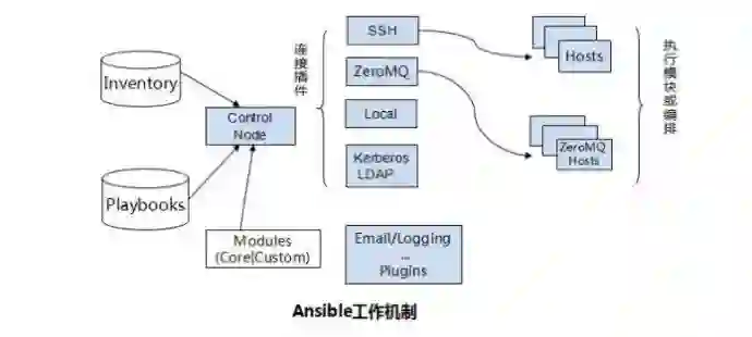 基于以上考虑,我们初步选定了Ansible作一个尝试。这里用图例描述下Ansible的工作机制: