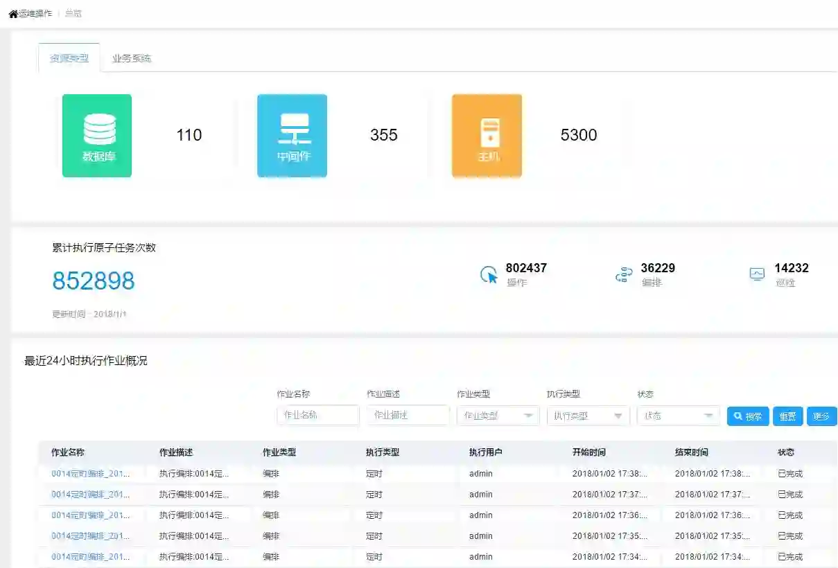 下图是平台在生产环境中执行的统计数据,从四个维度展示了整个系统的操作数据量:巡检、编排、操作和原子任务。