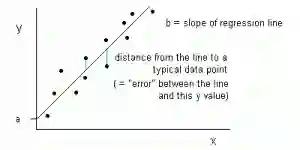 在线性回归中,输入变量 x 和输出变量 y 的关系可以用一个方程的形式表达出来:y=ax+b。所以,线性回归的目标就是寻找参数 a 和 b 的值。这里,a 是直线的斜率,b 是直线的截距。