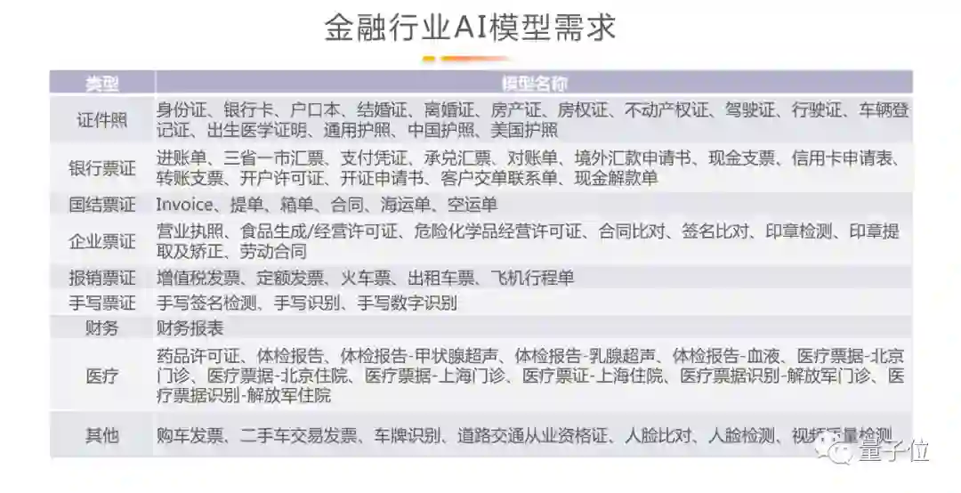 这里列了一个比较完整版本的模型需求,包含各类证件照、银行票证、企业票证以及各类财务报表、医疗票据等。这些文本不仅种类繁多,版式各异,甚至还有不同语言。上百种不同专业领域里面的各种单证,对应每一家金融机构具体场景的真实的业务数据,这样的场景就比较适合用大模型和小训练数据的方式去精调。