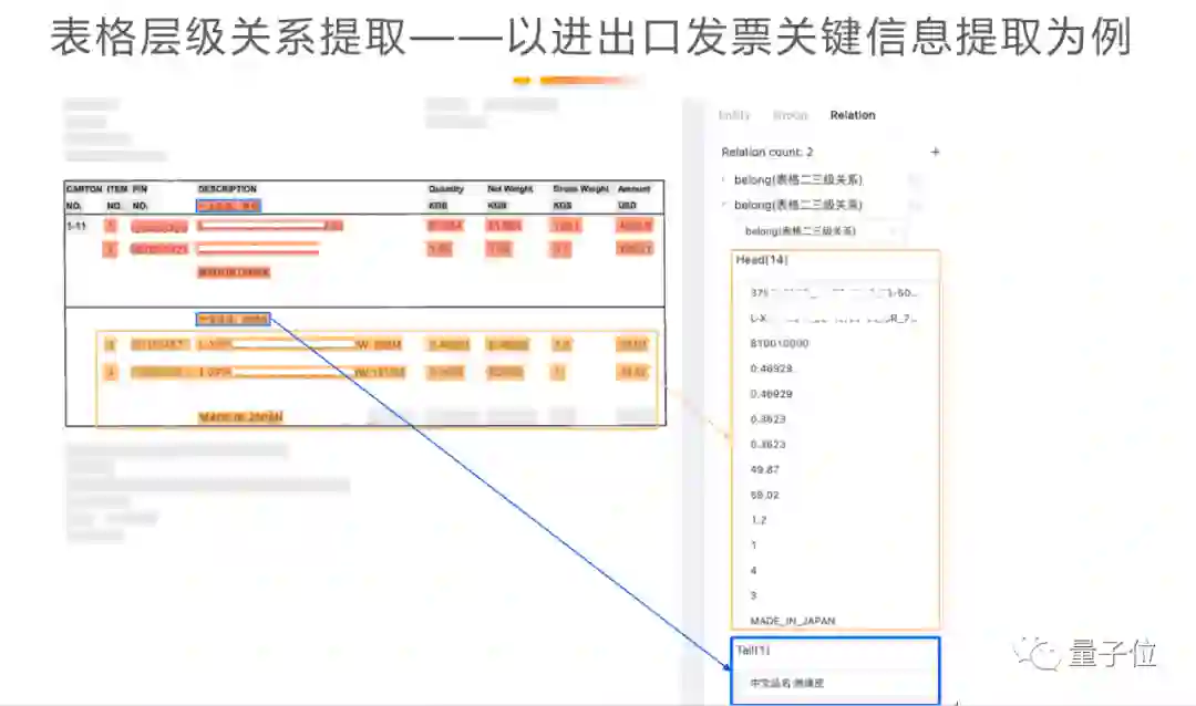 例子左上角是客户的名字和地址,表格中标明了具体的什么货物、多少钱以及总价。模型通过实体抽取就可以将其变成单个字段,抽取具体的“值”。这张INVOICE里包含一些逻辑关系的表格的,这个关系也需要用大模型加小数据做训练来提取。
