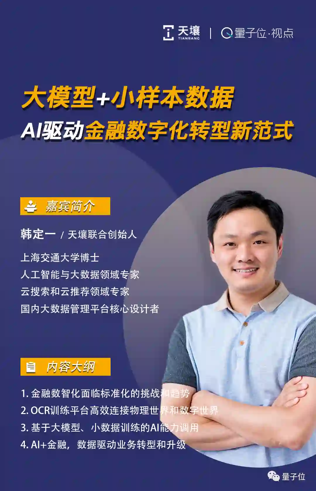 关于金融数字化领域,如何利用大模型和小样本数据解决一些实际业务场景的问题,天壤联合创始人韩定一在「量子位·视点」直播中分享了他的从业经验和观点。