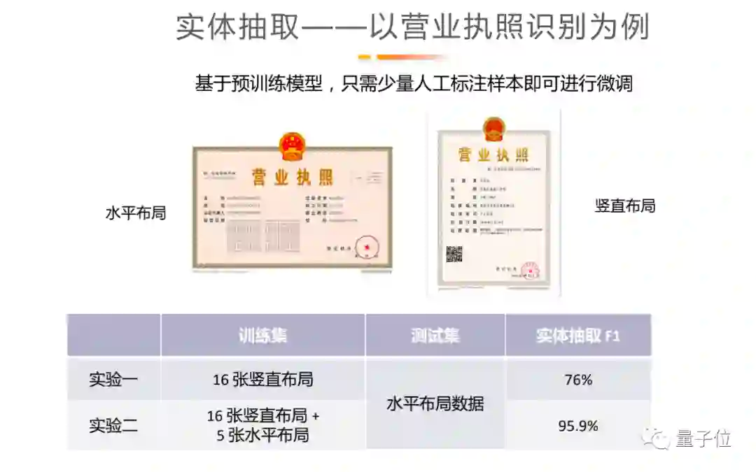 再举一个具体步骤的例子,比如营业执照识别分为横版和竖版,具体应用时,第一批拿到的数据可能全部都是竖版、没有横版。我们当时使用16张竖版数据训练得到的模型,应用到横版的数据集中,准确率只有76%,f1 score precision和recall这些综合指标都不太理想。在补充标注了一些横版的数据集后,只需要5张就能够提升准确率到95.5%。
