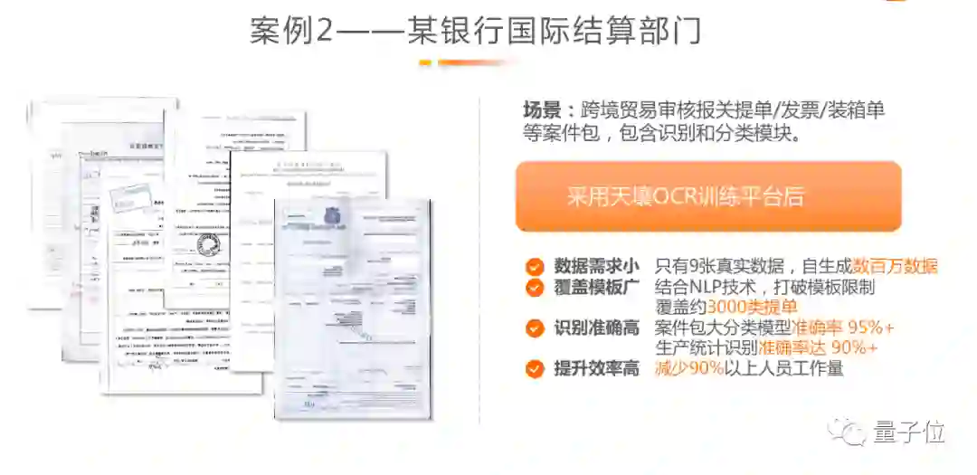 银行业务中原本的单证审核依赖人工效率非常低。天壤利用小规模的数据去快速训练模型,再结合NLP的预训练模型小数据样本的调整,用一个模型快速识别3000种不同的表单,准确率超过95%,减少了90%以上人力工作。