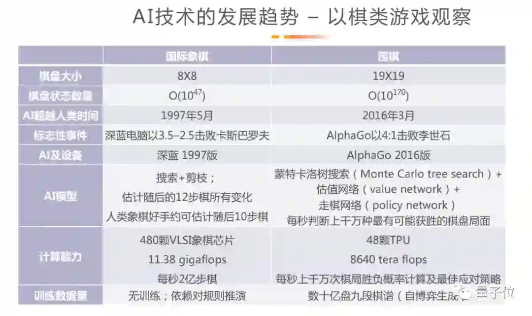 AI围棋又是如何击败世界冠军?当年在国际象棋中,AI使用的是搜索的方法:将围棋的棋盘状态和接下来可能发生的变化一一枚举,然后判断哪种情况结果更好。这样的AI模型算法简单,但是规模非常大,工程难度高,实现这样的模型只需要现在计算机系大三学生的水平就足够。IBM为了支持这样的程序,专门研制了VLSI象棋芯片,每颗芯片每秒进行11.38亿次浮点计算,意味着每秒可以计算2亿步棋,对应到国际象棋棋盘中就是能够估算当前棋面12步后的棋盘变化,而最厉害的人类国际象棋棋手大概只能估算到10步以内的局面变化。