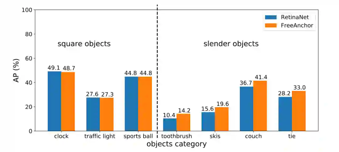 手工设计的锚框分配在两种情况下失败:物体特征偏心和拥挤场景。FreeAnchor有效地缓解了这两个问题。对于容易出现特征偏心的细长物体类别,如牙刷,滑雪板,沙发和领带,FreeAnchor显著优于RetinaNet基线,如图4所示。对于其他物体类别,包括时钟,交通信号灯和运动球FreeAnchor的性能相当与RetinaNet。其原因在于,学习匹配过程驱动网络激活每个物体的锚框集合内的至少一个锚框,以便预测正确的类别和位置。激活的锚框没有必要与物体空间对齐,只需要有对物体分类和定位的最具代表性的特征。