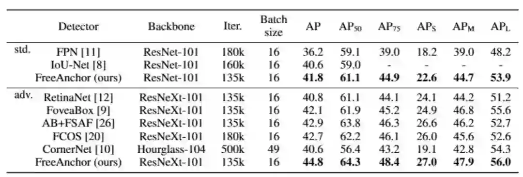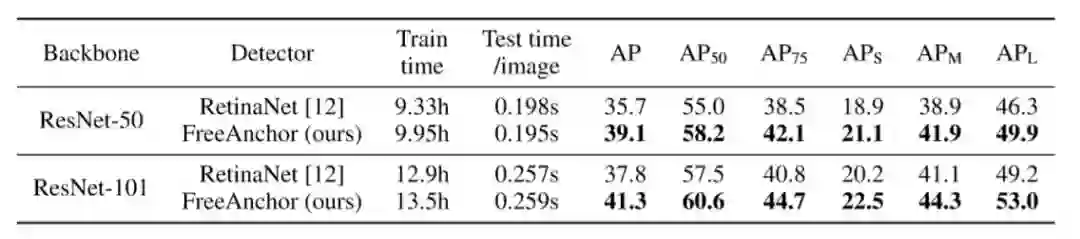 表2将FreeAnchor与RetinaNet基线进行比较。FreeAnchor通过可忽略不计的训练和测试时间成本将AP提升至3.5%左右,这对具有挑战性的通用物体检测任务来说是一个显著提升。