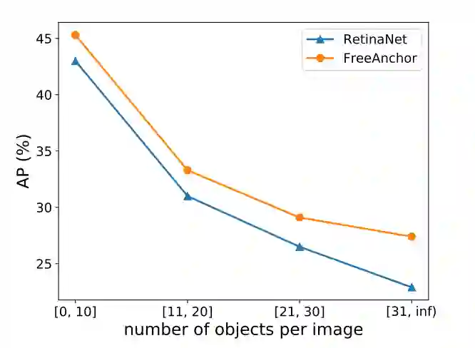我们进一步比较了RetinaNet和FreeAnchor在拥挤场景中的表现,如图5所示。随着单个图像中物体数量的增加,FreeAnchor对RetinaNet的提升变得越来越明显。这表明FreeAnchor具有学习匹配锚框的能力,可以在拥挤的场景中为物体选择更合适的锚框。