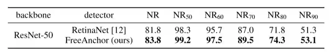 2. 保证与NMS的兼容性:为了评估锚框预测与NMS的兼容性,我们将NMS召回率()定义为给定IoU阈值τ时,在NMS之前和之前的召回率之比。遵循COCO中AP的定义方式,NR被定义为τ从0.50以0.05为间隔变化到0.90中NRτ的平均值。在表1.中我们用NRτ比较了RetinaNet和FreeAnchor。可以看出,FreeAnchor的NR值显著高于RetinaNet,意味着与NMS的兼容性更高,验证了自由锚框匹配损失可以实现分类和定位的联合优化。