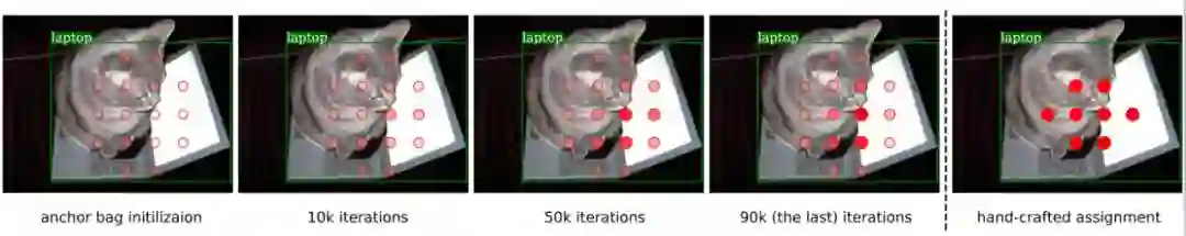 图 3 为“笔记本电脑”学习匹配锚框(左)与手工设计锚框分配的比较(右),红点表示锚中心。较红的点表示较高的置信度。为清楚起见,我们从所有50个锚框中选择了16个长宽比为1:1的锚框。