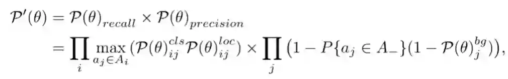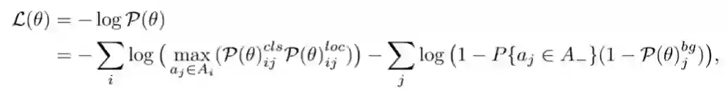 为了实现以上目标,我们将物体-锚框匹配表示为最大似然估计(MLE)过程,从每个物体的锚框集合中选择最具代表性的锚框。定义每个锚框集合的似然概率为包中各锚框预测置信度的最大值,保证了存在至少一个锚框,对物体分类和定位都具有很高的置信度。同时,具有较大定位误差的锚框被归类为背景。在训练期间,似然概率被转换为损失函数,然后该函数同时驱动物体-锚框匹配和检测器的学习。