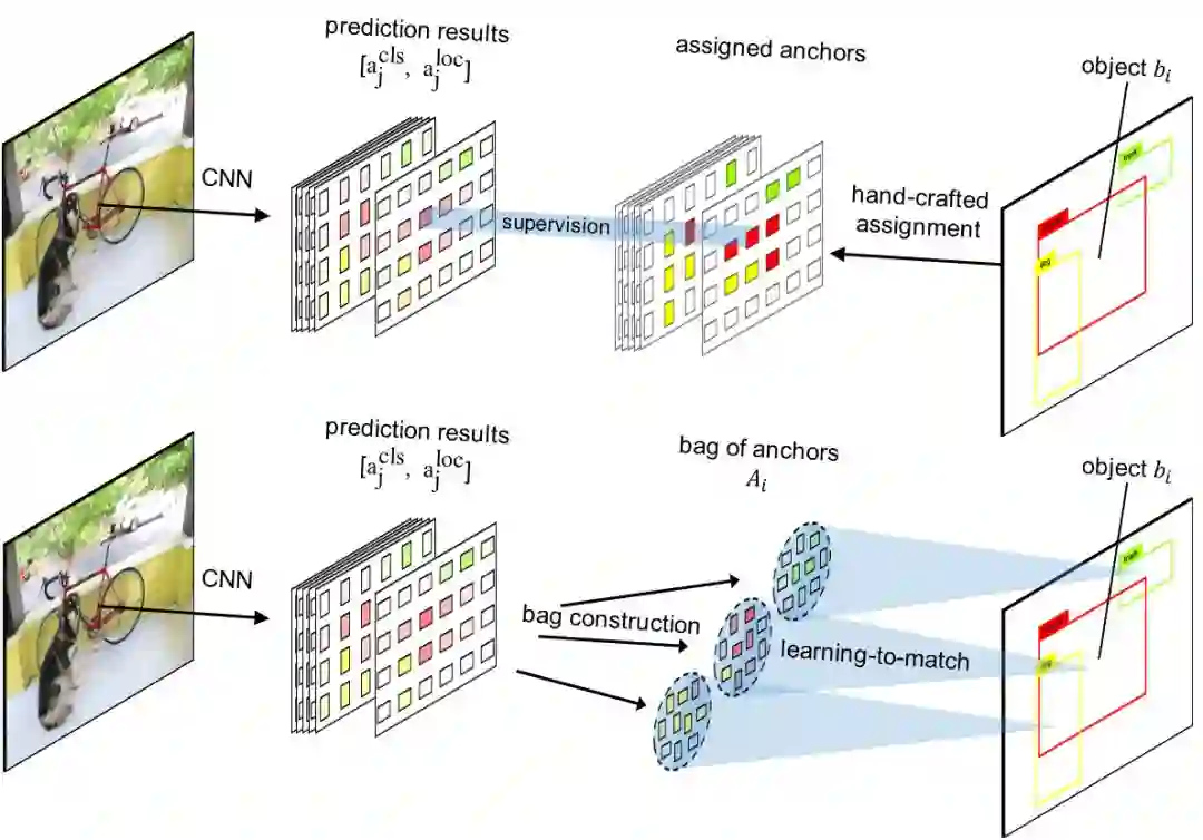 过去几年中,卷积神经网络(CNN)在视觉物体检测中取得了巨大成功。为了使用有限卷积特征表示具有各种外观,纵横比和空间布局的物体,大多数基于CNN的检测器利用具有多尺度和多长宽比的锚框作为物体定位的参考点。通过将每个物体分配给单个或多个锚框,可以确定特征并进行物体分类和定位。有锚框的物体检测器利用空间关系,即物体和锚框的交并比(IoU),作为锚框划分的唯一标准。基于与物体边界框(Box)空间对齐的锚框(Anchor)最适合于对物体进行分类和定位的直觉,网络在每个锚框处的损失独立地监督下进行学习。然而,在下文中,我们认为这种直觉是不准确的,手工设计IoU匹配物体与特征的方法不是最佳选择。