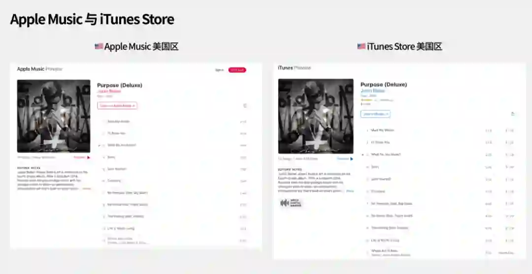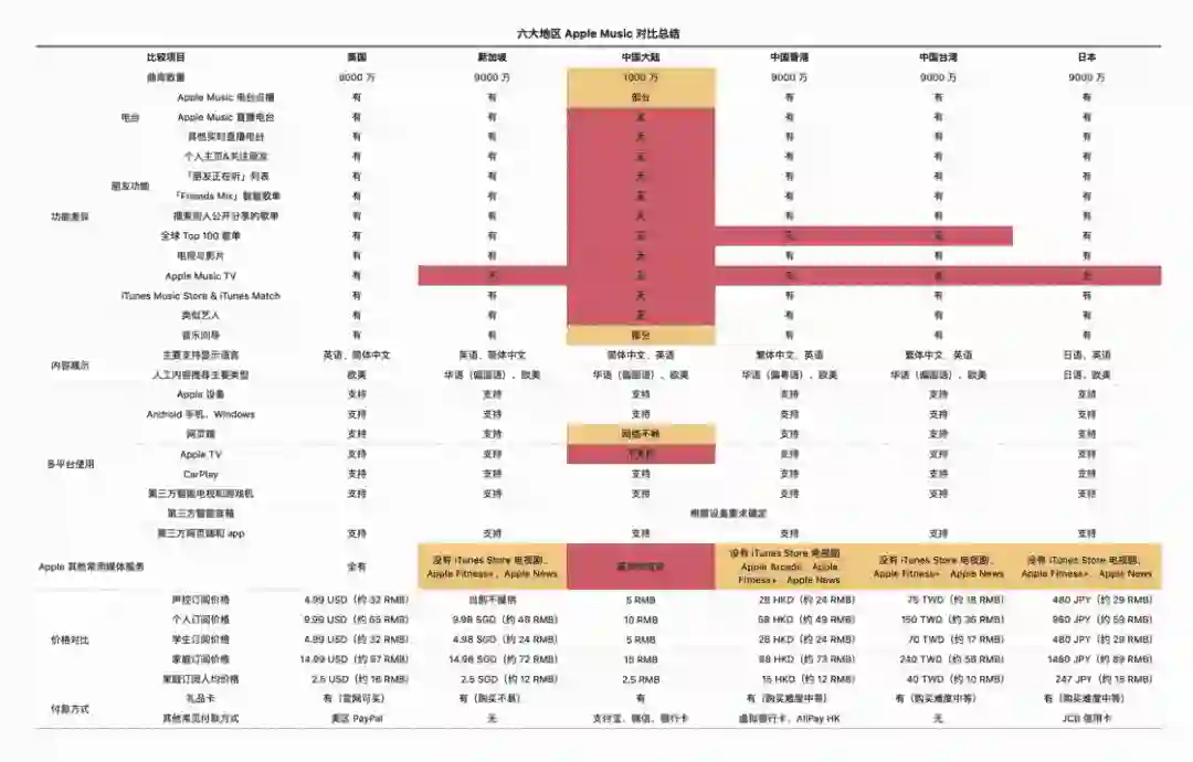 日区:曲库丰富,功能齐全,英文和日语界面兼顾,没有中文支持,本土特色十足,Apple 媒体服务基本齐全,充值卡购买难度中等,适合钟情日语歌曲和欧美歌曲、偏爱多个 Apple 媒体服务、不介意日文/钟情于日本文化的你。