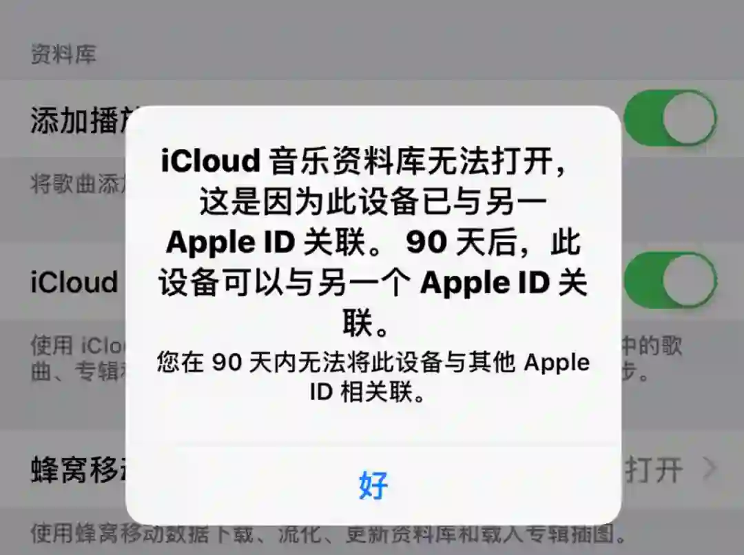 绑定后,若再使用其他 Apple ID 开启 Apple 媒体内容下载功能时,系统会提示此设备已与其他 Apple ID 绑定,并告知还剩余多少时间。(若不小心错误地触发绑定,可联系 Apple 官方客服,有一定几率可以提前解绑。)