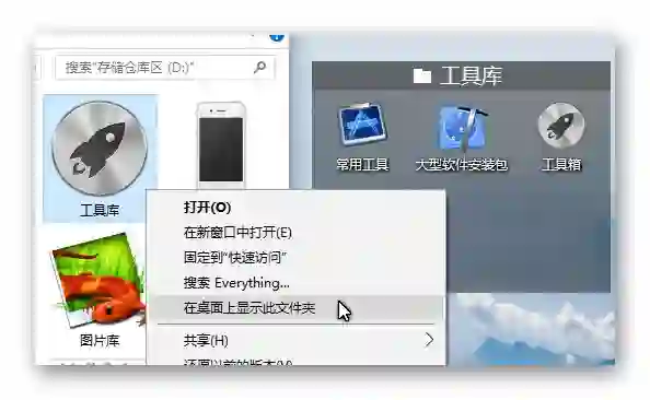 方法一: 在任意一个文件夹上 右键 → 在桌面上显示此文件夹,就可以在桌面上创建一个文件夹快捷入口。