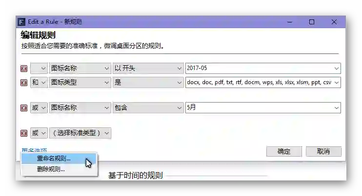比如我想把桌面上 5 月份的文件都放到一个分区中。我可以通过多个规则的制定,可以把文件按实际需求进行分类、排序。