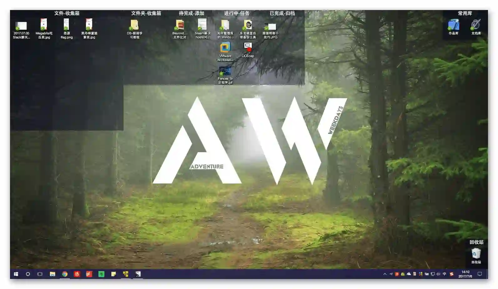 下图是我目前的桌面,我利用 Fences 建立了自己的文件处理流程。采用了类似于 GTD 的桌面分区方式,所有的新增文件放入 Inbox 中,文件夹放入文件夹的 Inbox 中。