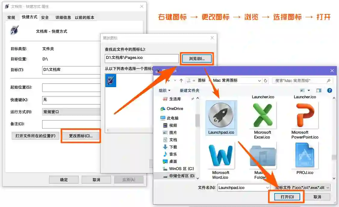 右键 快捷方式 → 属性 → 快捷方式 → 更改图标 → 浏览 → 选择图标 →确定 ,即可更换图标。