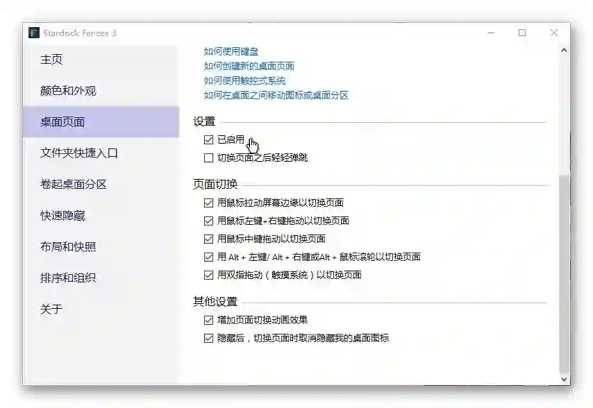 在 桌面页面 中启用,桌面就可以像手机一样,整屏整屏地移动。鼠标在桌面的最右侧往左滑动,或是使用键盘快捷键都可以切换图标屏幕。如果你的电脑有触摸屏,还可以设置为 双指拖动切换页面 ,相当方便。