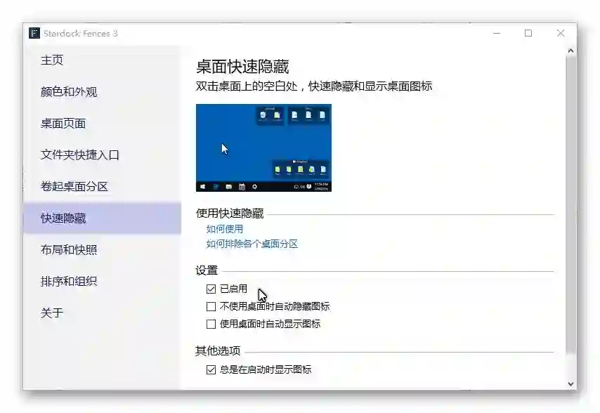 快速隐藏 是 Fences 默认开启的一个功能,可以隐藏桌面上的所有图标。
