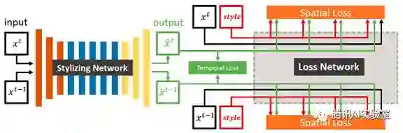 Gatys等人工作虽然取得了非常好的效果,但是缺点是基于优化,非常耗时;到2016 ECCV时,Johnson等人[3]提出了使用深度前向神经网络替代优化过程,实现了实时的图像风格迁移,修图工具Prisma随之风靡一时。但直接将图像风格迁移的方法应用到视频上,却会使得原本连贯的视频内容在不同帧中转化为不一致的风格,造成视频的闪烁跳动,严重影响观感体验。为了解决闪烁问题,Ruder等人[4]加入了对时域一致性的考虑,提出了一种基于优化的视频艺术滤镜方法,但速度极慢远远达不到实时。