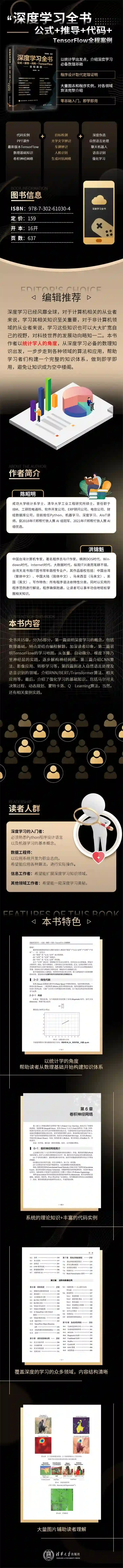 《深度学习全书——公式+推导+代码+TensorFlow全程案例》共有15章,分为5部分,第一篇说明深度学习的概念,包括数理基础,特点是结合编程解题,加深读者印象,第二篇说明TensorFlow的学习地图,从张量、自动微分、梯度下降乃至神经层的实践,逐步解构神经网络,第三篇介绍CNN算法、影像应用、转移学习等,第四篇则进入自然语言处理及语音识别的领域,介绍RNN/BERT/Transformer算法、相关应用等,最后,介绍了强化学习的基础知识,包括马尔可夫决策过程、动态规划、蒙特卡洛、Q Learning算法,当然,还有相关案例实践。