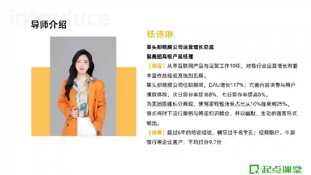 本次公开课由从事互联网产品与运营工作10年,对各行业运营增长有着丰富作战经验及独到见解的杨诗琳老师亲自授课。