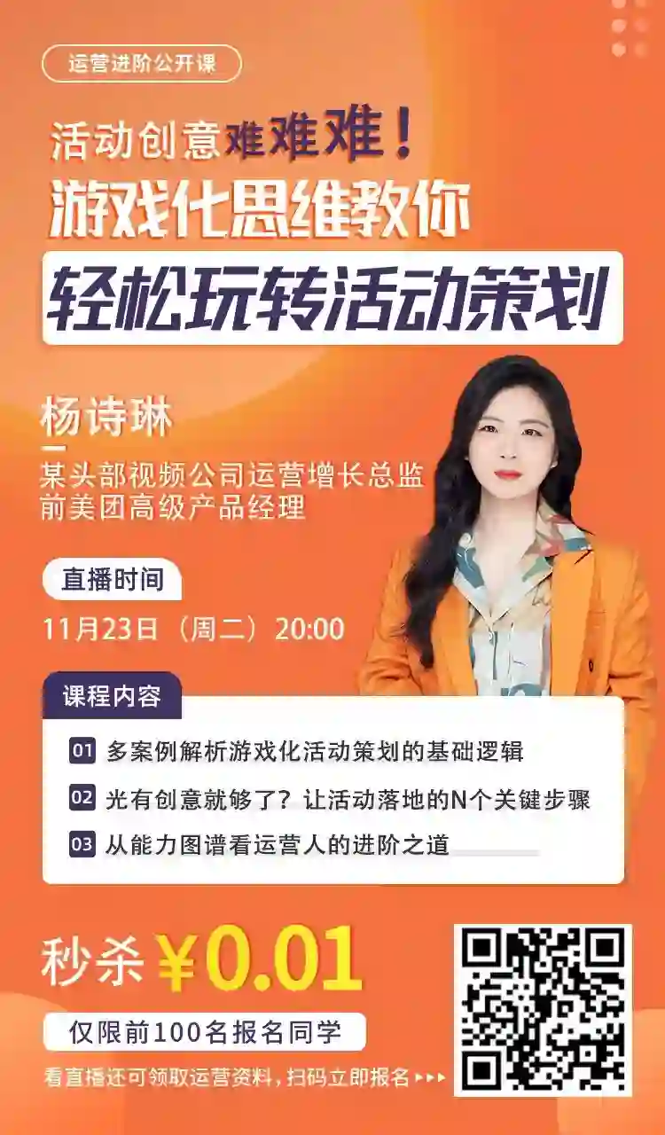 11月23日(周二)20:00点,我们特邀了某头部视频公司运营增长总监、前美团高级产品经理@杨诗琳老师为大家进行分享!!!