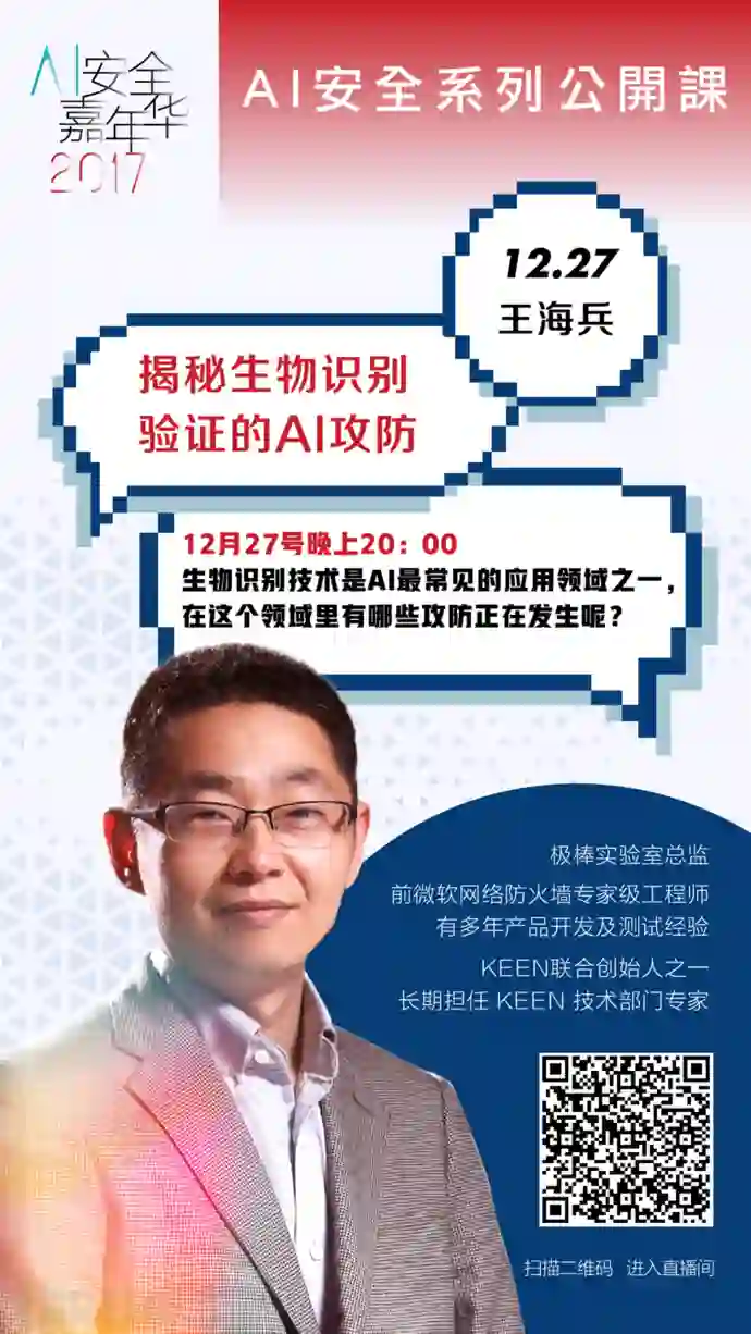 12月27日(周三)晚20:00,AI公开课第五节,极棒实验室总监王海兵,带来主题为《揭秘生物识别验证的 AI 攻防》的分享。