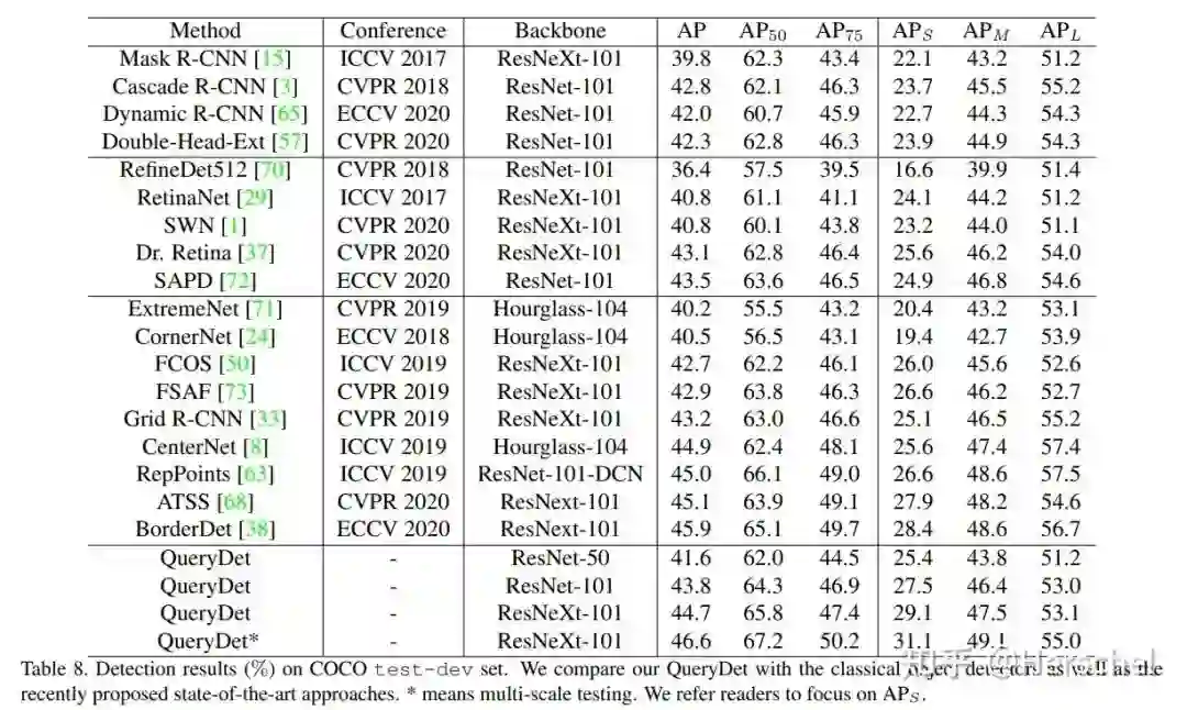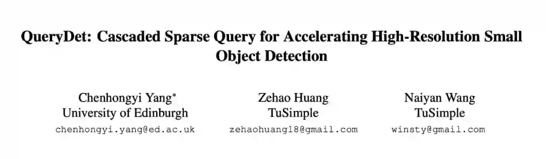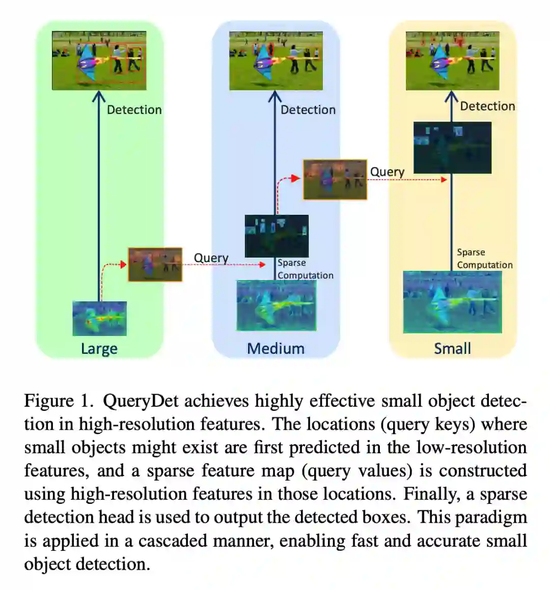 QueryDet 利用 high-resolution feature 来提升小目标检测性能的同时,通过 CSQ 机制,利用高层低分辨率特征初筛含有小目标的区域,在高分辨特征层上利用初筛获得的位置,使用 sparse convolution,极大地节约了计算消耗。