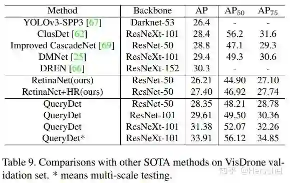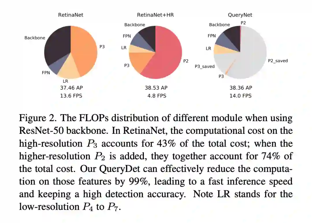 可以看出原版 RetinaNet 中,最低层 P3 就占据了总计算量的很大部分;引入更高分辨率的 P2 助力小目标检测后,P2 的计算开销占到了总开销的一半以上;加入最终模型 QueryDet 进行比较,可以看出 QueryDet 在减小高分辨率上的计算开销同时提高了推理速度。
