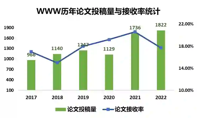 下图为WWW会议历年论文投稿量与接收率统计图,可以看出投稿量和接收率大体上呈现出每年都有新增的趋势。今年的接收率相比于去年有大幅度下降,但投稿量有所提高。