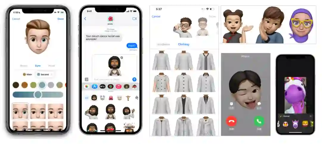 具有国际化并多样性的素材可供用户DIY自己的头像和下半身(腰部以上)该功能与facetime和iMassage互联,将能在视频通话和短信发送上增添更多互动与乐趣。