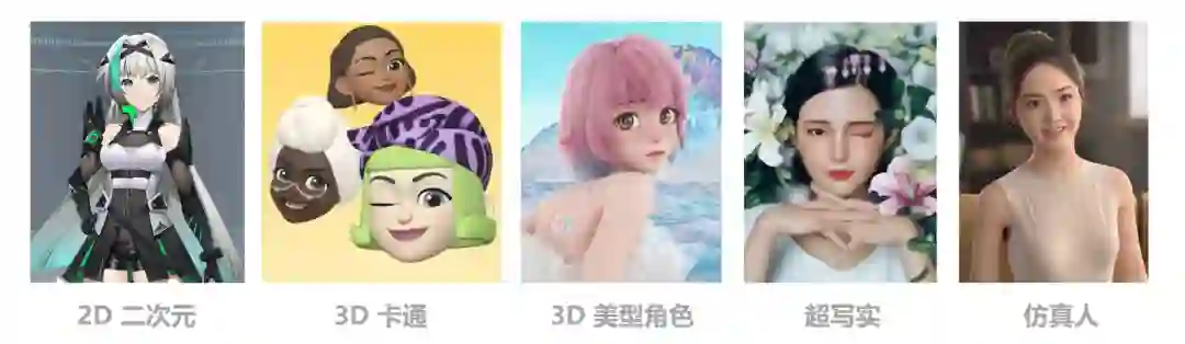 按照虚拟人的外形特征,可分为2D二次元、3D卡通、3D美型、超写实、和仿真人六大类。