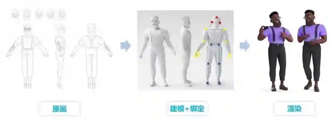 形象生成的过程即为建立数字资产的过程,通常由原画师负责虚拟人的外观设计,绘制出平面形象,再由3D建模师将原画转换为立体的模型;在建模的过程中,建模设计师的经验显得尤为重要,通过合理的叠加贴图方式和精度取舍,可以让虚拟人达到系统可以承载范围内的最佳效果。