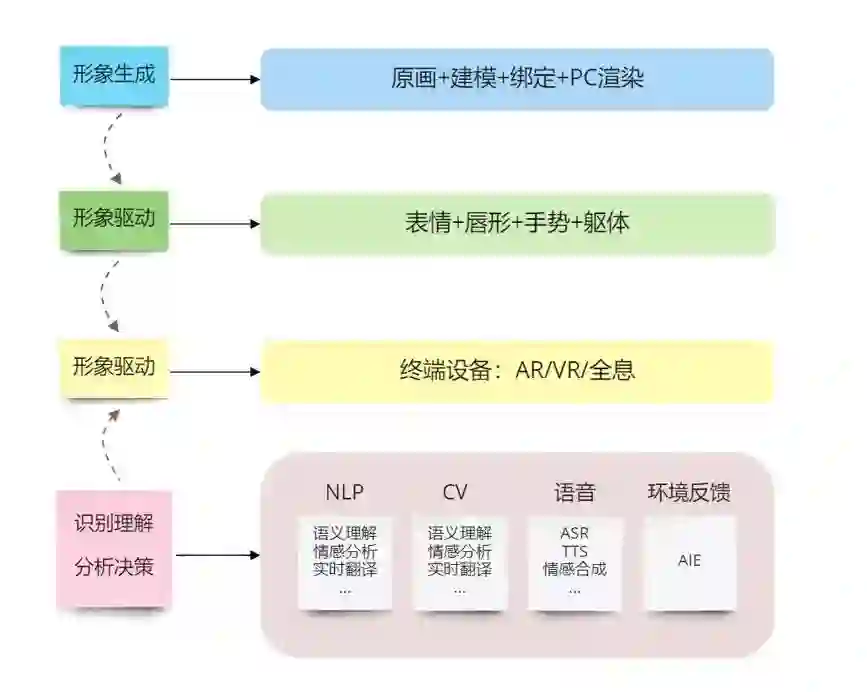 手机虚拟人作为虚拟人在移动端上的落地产品,其技术架构与常规虚拟人类似,其通用系统框架可分为形象生成、形象驱动、形象渲染以及识别理解+分析决策模块。